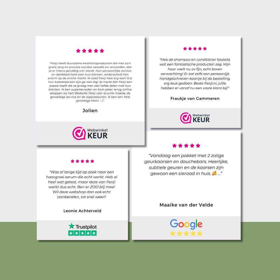 We hechten enorm veel waarde aan de meningen/ervaringen van onze klanten, maar wat vinden ze nu eigenlijk van ons en onze producten? Onze reviews zijn onder meer afkomstig van WebwinkelKeur Trustpilot Google en Facebook. Wij zijn erkend WebwinkelKeur lid waardoor onze webshop voldoet aan de belangrijkste Nederlandse wetgeving en jij verzekerd bent van een aankoop bij een betrouwbare webshop.